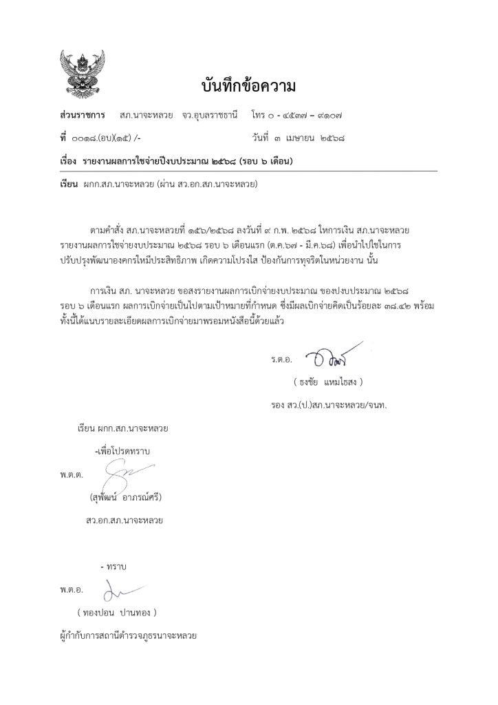 012 แผนการใช้จ่ายงบประมาณประจำปีและรายงานผลการใช้จ่ายงบประมาณประจำปี แผนการใช้จ่ายงบประมาณ ของสถานีตำรวจภูธรนาจะหลวย ประจำปีงบประมาณ 2568 รายงานผลการใช้จ่ายงบประมาณ รอบ 6 เดือนแรก (ต.ค.67 - มี.ค.68) สรุปภาพรวมการใช้งบประมาณ ปีงบประมาณ 2568 (1ต.ค.67 - 31 มี.ค.68)