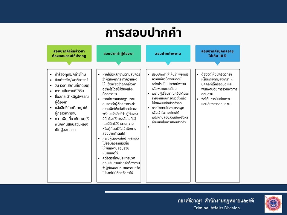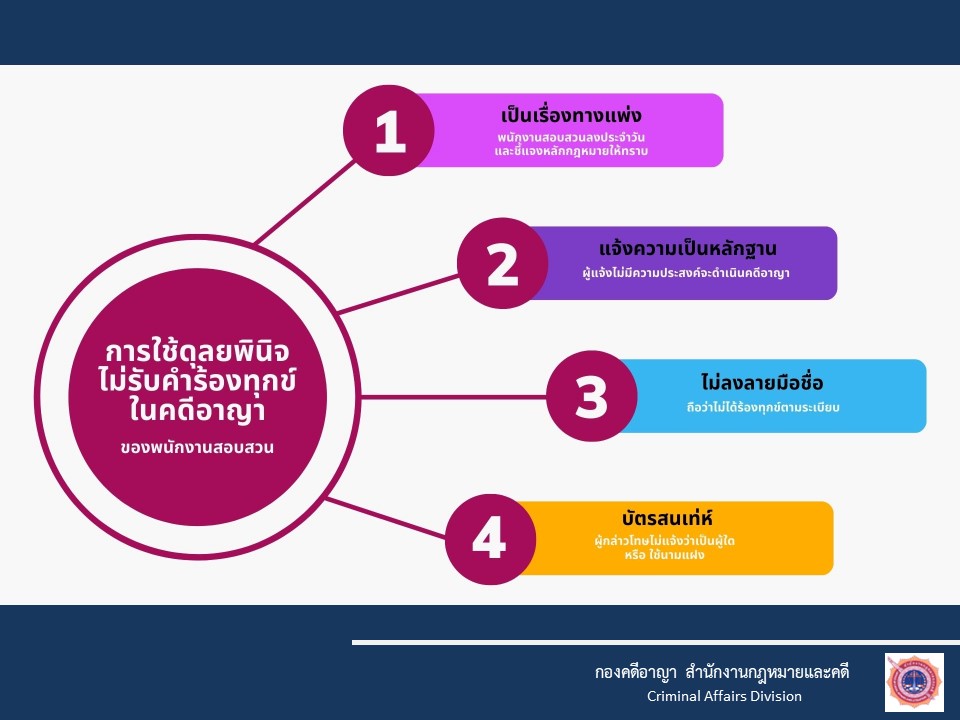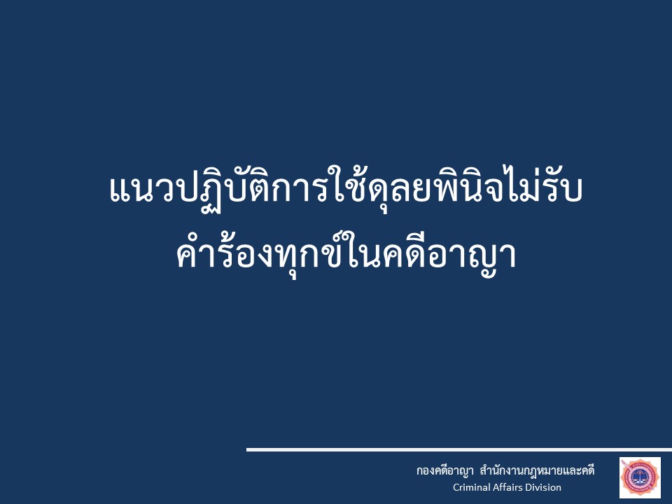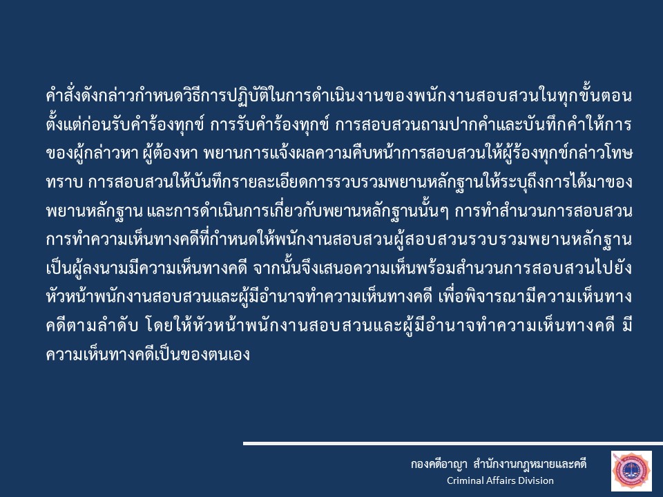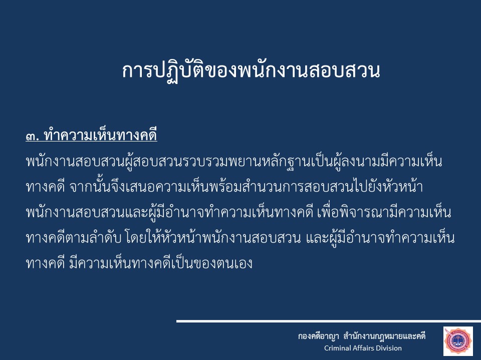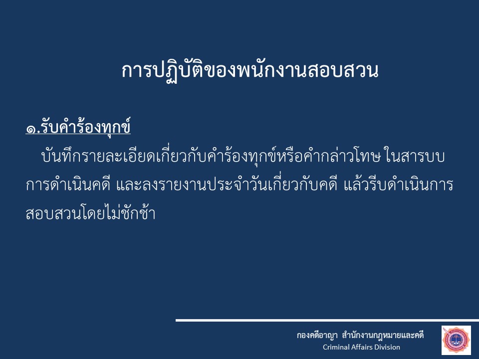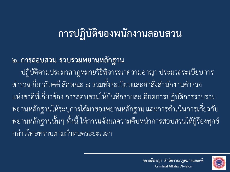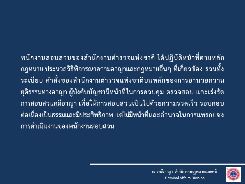 O3 กฎหมายที่เกี่ยวข้อง กฎหมายใหม่ พ.ร.บ.ป้องกันและปราบปรามการทรมานและการะทำให้บุคคลสูญหาย พ.ศ.2565 พ.ร.บ.ว่าด้วยการปรับเป็นพินัย พ.ศ.2565 กฎหมายที่เกี่ยวข้อง ประมวลกฎหมายอาญา ประมวลกฎหมายวิธีพิจารณาคดียาเสพติด ประมวลกฎหมายวิธีพิจารณาความอาญา ประมวลกฎหมายยาเสพติด แก้ไขเพิ่มเติมประมวลกฎหมายอาญา (ฉบับที่ ๒๘) แก้ไขเพิ่มเติมประมวลกฎหมายอาญา (ฉบับที่ ๒๖) กฎหมายในความรับผิดชอบสำนักงานตำรวจแห่งชาติ พระราชบัญญัติตำรวจแห่งชาติ พ.ศ. 2565 พระราชบัญญัติข้อมูลข่าวสารของราชการ พ.ศ. 2540 พระราชบัญญัติ การจัดซื้อจัดจ้างและการบริหารพัสดุภาครัฐ พ.ศ. 2560 กฎ ก.ตร. ว่าด้วยการแต่งตั้งข้าราชการตํารวจ พ.ศ. 2561 กฎ ก.ตร.ว่าด้วยหลักเกณฑ์และวิธีการแต่งตั้งยศ พ.ศ.2554 กฎ ก.ตร.ว่าด้วยการกำหนดหลักเกณฑ์และวิธีการพิจารณาเลื่อนเงินเดือนข้าราชการตำรวจ พ.ศ.2556 แผนการป้องกันและบรรเทาสาธารณภัย สำนักงานตำรวจแห่งชาติ พ.ศ.2559 การชุมนุมสาธารณะ พระราชบัญญัติการชุมนุมสาธารณะ พ.ศ. ๒๕๕๘– ประกาศสำนักงานตำรวจแห่งชาติ เรื่อง กำหนดระดับเสียงของเครื่องขยายเสียงที่ใช้ในการชุมนุมสาธารณะ พ.ศ.๒๕๕๘– ประกาศสำนักนายกรัฐมนตรี เรื่อง เครื่องมือควบคุมฝูงชนในการชุมนุมสาธารณะ– ประกาศสำนักนายกรัฐมนตรี เรื่อง กำหนดวิธีการแจ้งการชุมนุมสาธารณะ อ้างอิง เว็บไซต์ที่เกี่ยวข้อง https://stat.bora.dopa.go.th/stat/statnew/statMONTH/statmonth/#/mainpa แนวทางการปฏิบัติตามกฎหมาย 1.แนวปฏิบัติในการจับหรือค้น 2.มาตรการป้องกันการแทรกแซง การใช้ดุลยพินิจ 3.แนวปฏิบัติในการใช้ดุลยพินิจไม่รับคำร้องทุกข์ในคดีอาญา 4.แนวปฏิบัติในการสอบปากคำของพนักงานสอบสวน 5.สิทธิของผู้เสียหายหรือเหยื่ออาชญากรรมและสิทธิผู้ต้องหา
